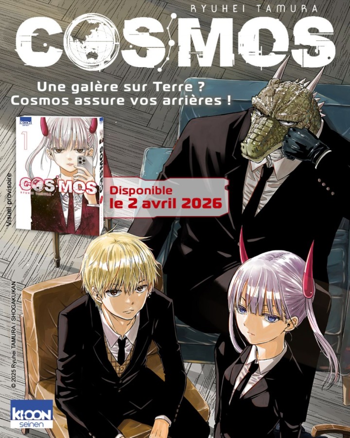 Cosmos (コスモス) est prépublié depuis le mois d’avril 2023 dans les pages du magazine Sunday GX (mensuel Seinen) des éditions Shogakukan. La série, dont la publication se poursuit, compte 7 tomes à ce jour. Le manga est recommandé par plusieurs auteurs réputés tels que Tite Kubo, Hiromu Arakawa ou encore Rumiko Takahashi. Il s’est par ailleurs classé 2e au prix Next Manga Awards 2025.