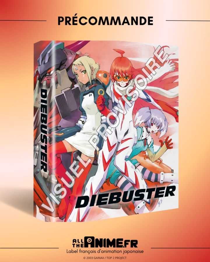 Diebuster, ou Top wo Nerae 2! DIEBUSTER (トップをねらえ2!DIEBUSTER) au Japon, est un OAV de 6 épisodes diffusés entre octobre 2004 et août 2006. Il s’agit de la suite du cultissime Gunbuster (aussi disponible chez All the Anime) de Gainax daté de 1988/1989.