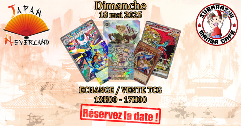 Le dimanche 18 mai 2025, rendez-vous chez Subarashii Manga Café pour une après-midi échange & vente de cartes en collaboration avec Japan Neverland