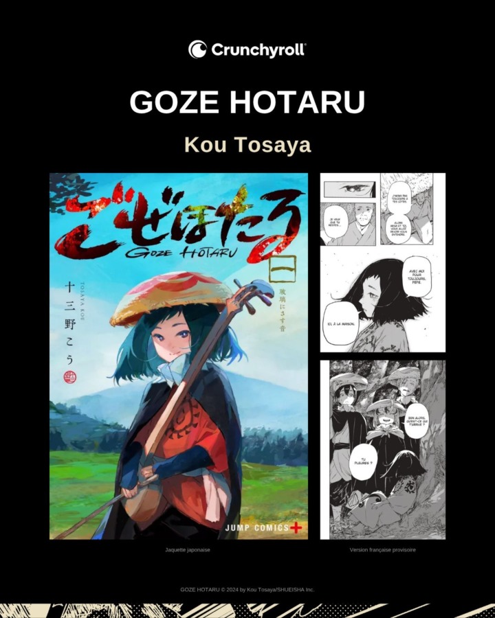 Il y a bientôt une semaine, jeudi dernier, les éditions Crunchyroll ont annoncé sur leurs réseaux sociaux l’arrivée dans leur catalogue d’une nouvelle série : Goze Hotaru, écrit et dessiné par Kou Tosaya. Le manga se présente comme un récit d’aventure où l’on suit Hotaru, une jeune fille malvoyante qui voit son handicap comme une contrainte, qui, après avoir vu un un spectacle des gozes avec son grand père, va vouloir suivre la voie de ces musiciennes itinérantes qui vivent de leur musique sans se laisser limiter par leur cécité. Elle se lance alors dans un voyage pour devenir une goze accomplie et même tenter de retrouver la trace de son père.