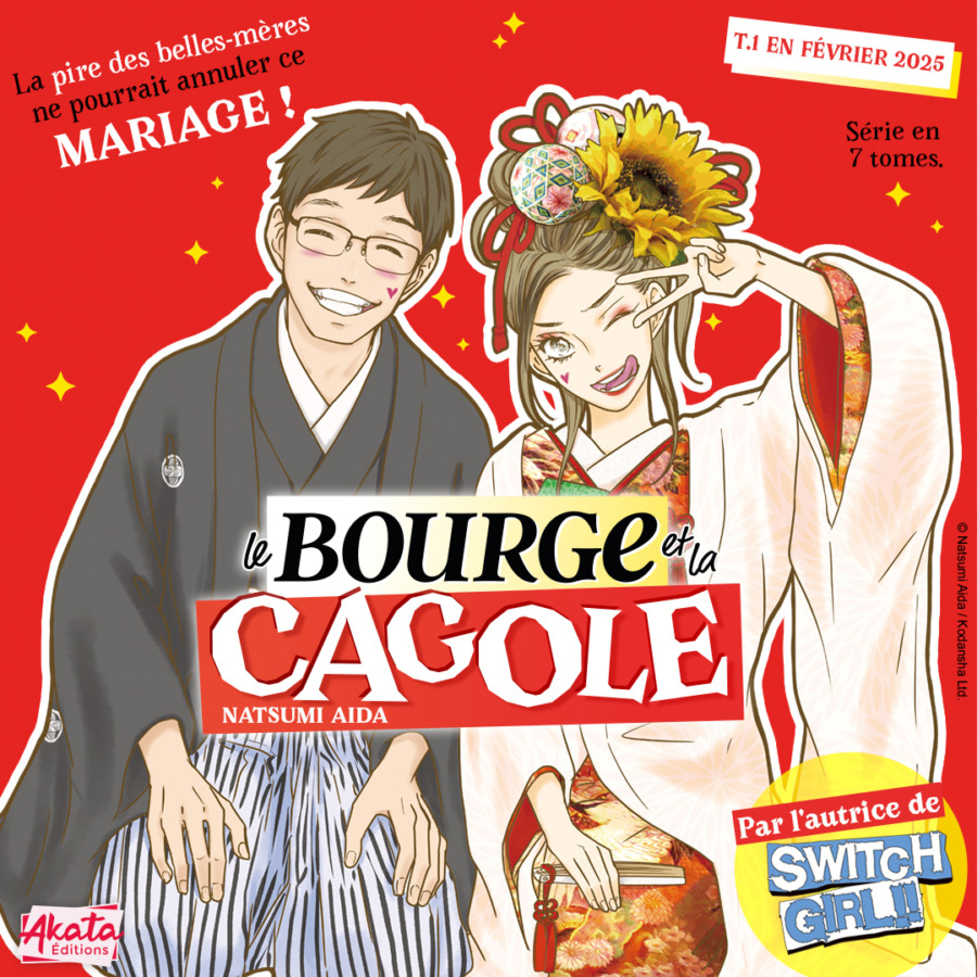 En fin de semaine dernière, vendredi, les éditions Akata ont annoncé l’arrivée dans leur catalogue du manga Le Bourge et la Cagole de Natsumi Aida, la « reine du shojo humoristique ». Le manga se présente comme une comédie romantique entre lutte des classes et quasi caricature où l’on suit un jeune homme venu d’une famille bourgeoise, Shûtarô, qui, alors qu’il est au plus mal mentalement, va tomber amoureux d’une ex-gyaru, Manatsu, et prévoir de se marier avec elle. Seulement sa famille, et plus particulièrement sa mère, va tenter d’empêcher ça.