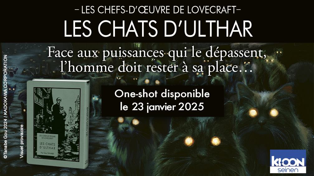 Dans la journée d’hier, les éditions Ki-oon ont annoncé sur leurs réseaux sociaux l’arrivée dans leur catalogue de l’anthologie Les Chats d’Ulthar de Gou Tanabe, adaptée d’histoires écrites par Howard Phillips Lovecraft. Le manga se présente comme la compilation de trois récits horrifiques et fantastiques tournés autour du rêve.