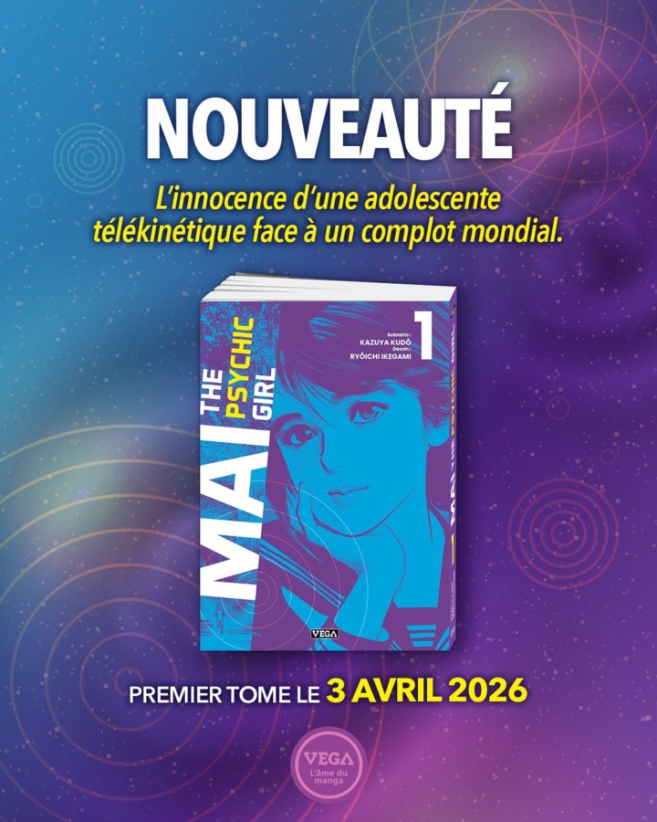 Hier, les éditions Vega ont annoncé sur leurs réseaux sociaux la sortie le mois prochain du manga Mai the Psychic Girl écrit par Kazuya Kudo et dessiné par Ryoichi Ikegami. La série se présente comme un récit d’action dans lequel on suit Mai, une adolescente ayant comme particularité ses pouvoirs psychiques. Alors qu’ils lui servent surtout pour faire des farces, elle va apprendre à ses dépends qu’ils peuvent aussi être une arme d’une force exceptionnelle et mortelle.