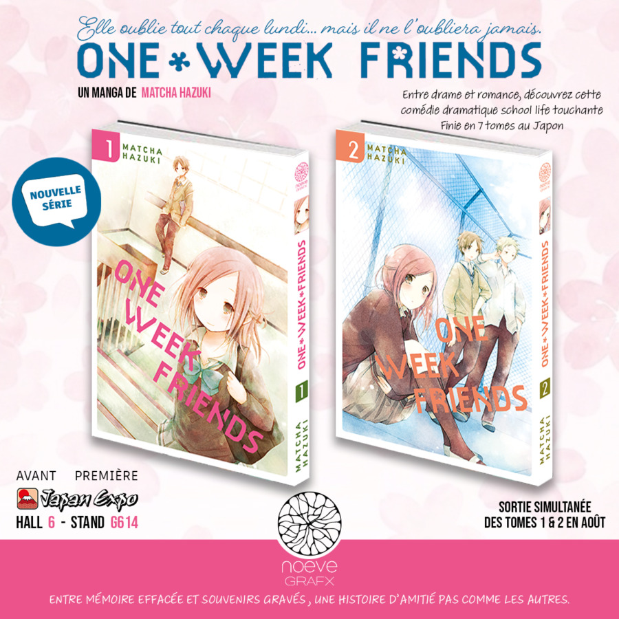 Comme nous le disions dans notre actualité récente sur le retour de Noeve Grafx, l’éditeur en a profité pour annoncer de nouvelles séries. Parmi elles : One Week Friends écrit et dessiné par Matcha Hazuki. La série se présente comme une comédie tranche de vie où l’on suit Kaori, une lycéenne solitaire qui perd la mémoire chaque lundi, son camarade Yûki va alors tout faire pour devenir son nouvel ami chaque semaine.