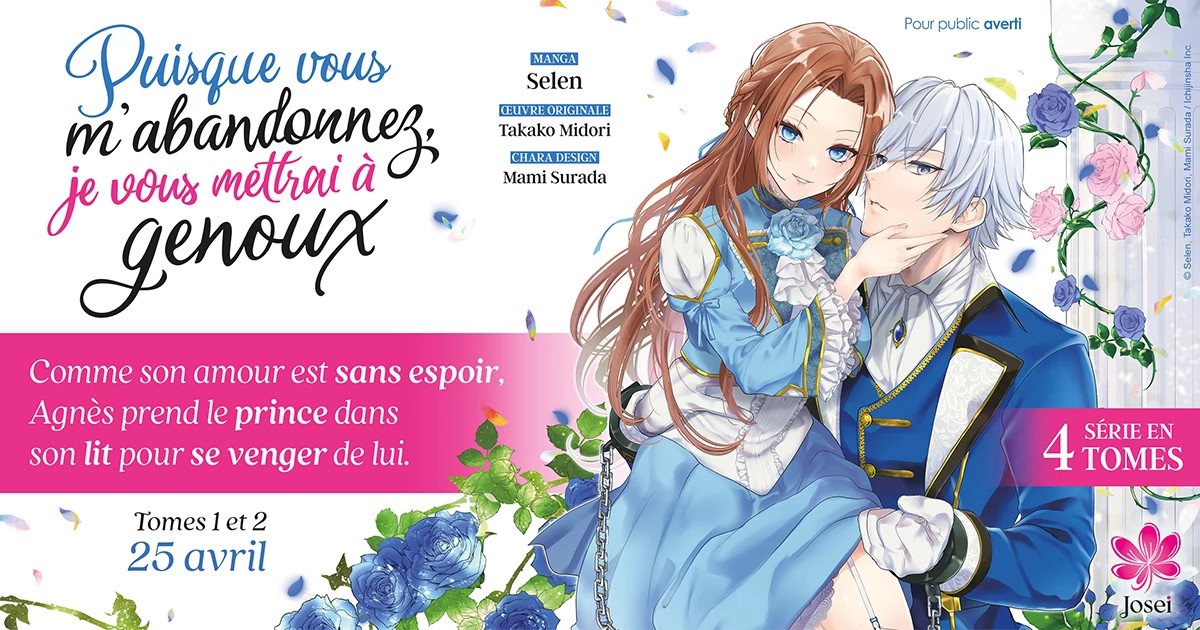 En fin de semaine dernière, les éditions Meian ont annoncé l’arrivée dans leur catalogue du manga Puisque vous m’abandonnez, je vous mettrai à genoux de Selen tiré du roman éponyme écrit par Takako Midori et illustré par Mami Surada. La série se présente comme une romance dramatique sombre où se mêlent passion vengeresse et obsession amoureuse entre un prince et la fille d’un marquis. La série est à réserver à un public averti.