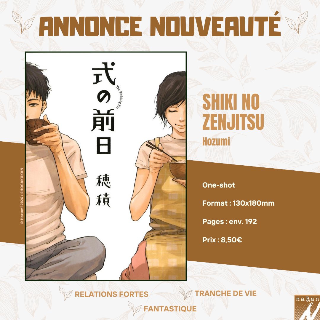 Il y a un peu plus de dix jours, les éditions naBan ont annoncé au travers de leur calendrier de l’avent sur leurs réseaux sociaux l’arrivée dans leur catalogue du recueil d’histoires courtes Shiki no Zenjitsu (titre provisoire) écrit et dessiné par Hozumi. Entre tranche de vie, fantastique et relations fortes, il s’agit là de l’occasion de retrouver le style de l’autrice au travers de six histoires courtes parmi lesquelles les derniers moments entre un frère et une sœur avant un mariage, une relation père/fille, et d’autres moments quotidiens flirtant parfois avec le fantastique.