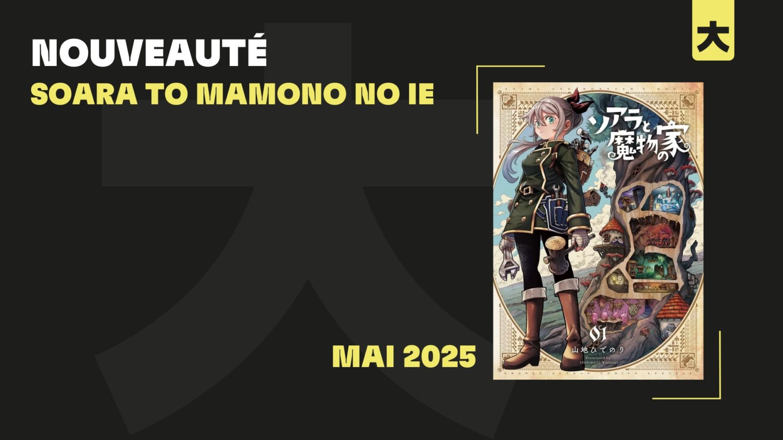 Soara to Mamono no Ie (ソアラと魔物の家) est prépublié depuis le mois de novembre 2021 dans les pages du magazine Shonen Sunday Super (mensuel Shonen) et sur la plateforme Sunday Web Every des éditions Shogakukan. La série, dont la publication est toujours en cours dans son pays d’origine, compte 4 tomes à ce jour. On connait déjà l’auteur, Hidenori Yamaji, pour ses mangas Atlantid (Kana) et surtout Marry Grave (Kana) qui avait été particulièrement bien reçu et compte toujours parmi les séries courtes populaires de ces dernières années.