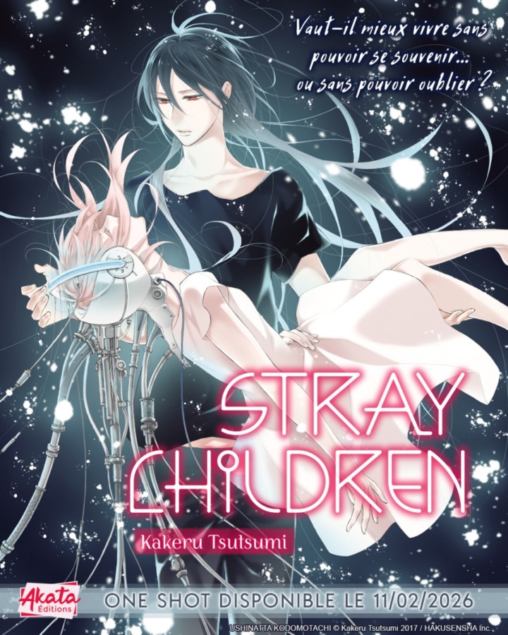 En fin de semaine dernière, les éditions Akata ont annoncé sur leur site internet et leurs réseaux sociaux l’arrivée dans leur catalogue du one shot Stray Children, écrit et dessiné par Kakeru Tsutsumi. Le titre se présente comme un récit de science-fiction dans un univers où l’espérance de vie humaine dépasse les 300 ans et que l’humanité a conçu une technologie permettant de modifier la mémoire, seulement cette technologie a vite été détournée de son usage d’origine à des fins discutables. On y suit Aya, un jeune homme au passé trouble, alors qu’il va prendre sous son aile une enfant à la mémoire défaillante.